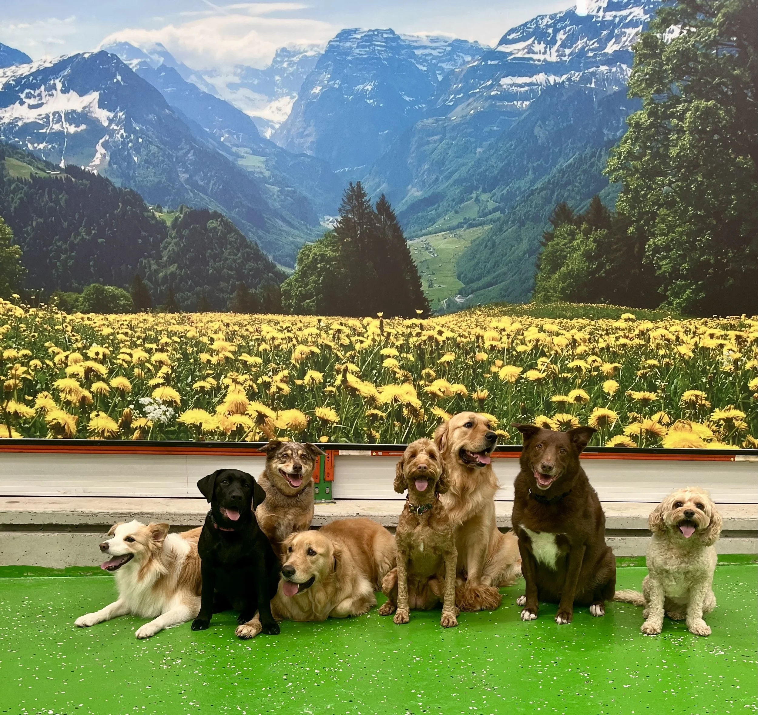 Group of seven dogs sitting indoors with a mountain and flower field mural backdrop.