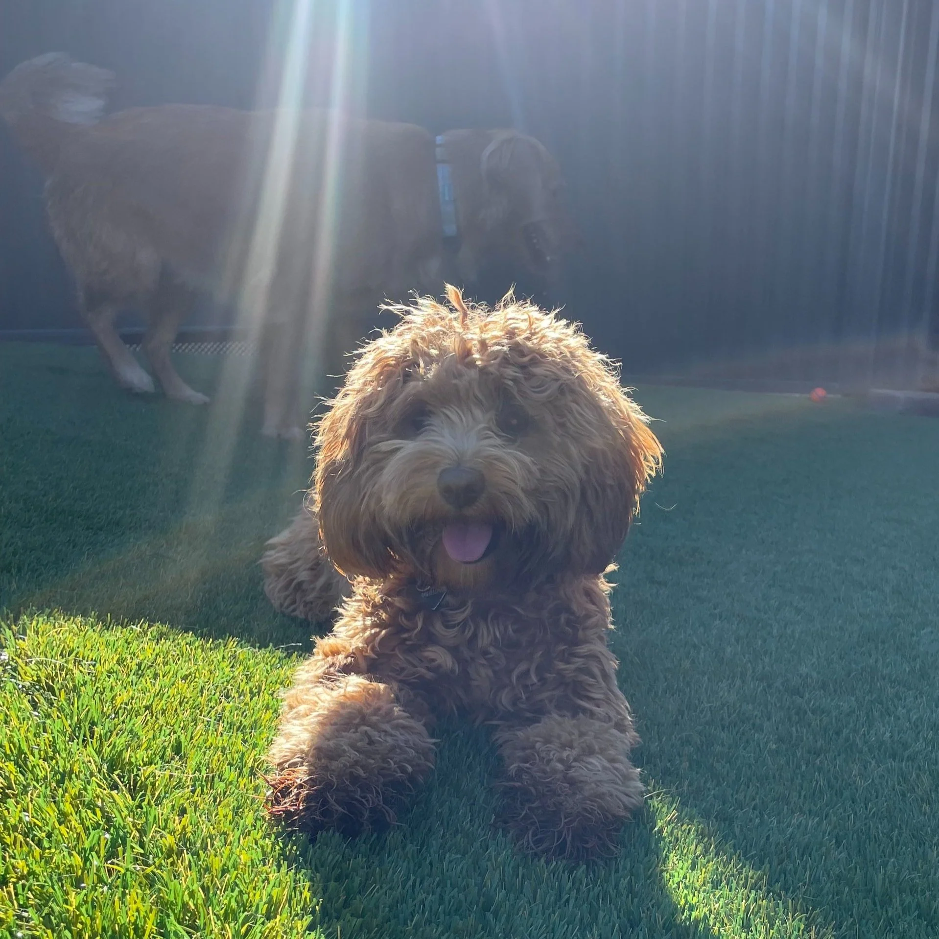 A happy, curly-haired brown puppy lying on green grass with sunlight shining down, with a larger dog in the background.