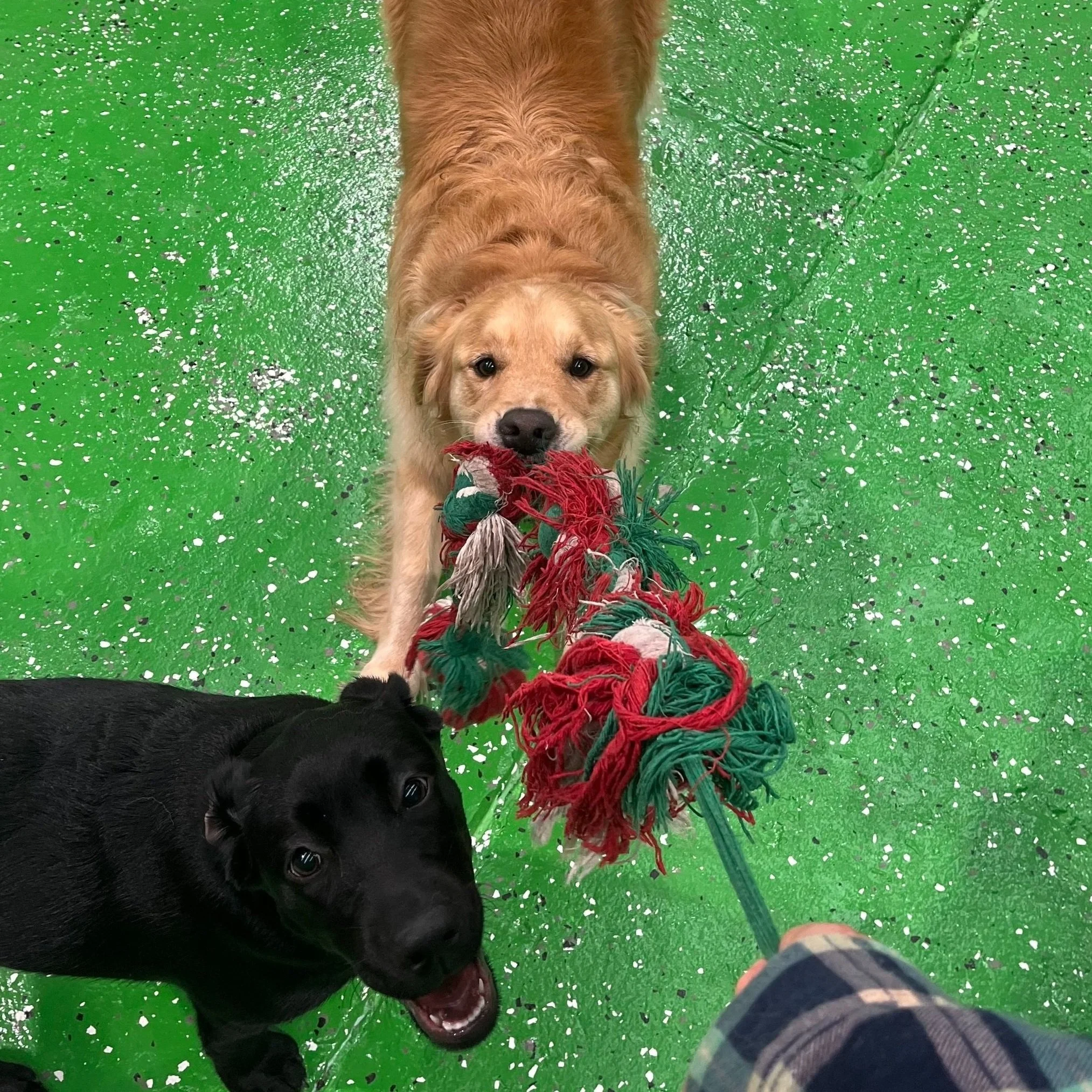 Two dogs, one golden retriever and one black Labrador, are playing tug of war over a red, green, and white rope toy on a green speckled floor.