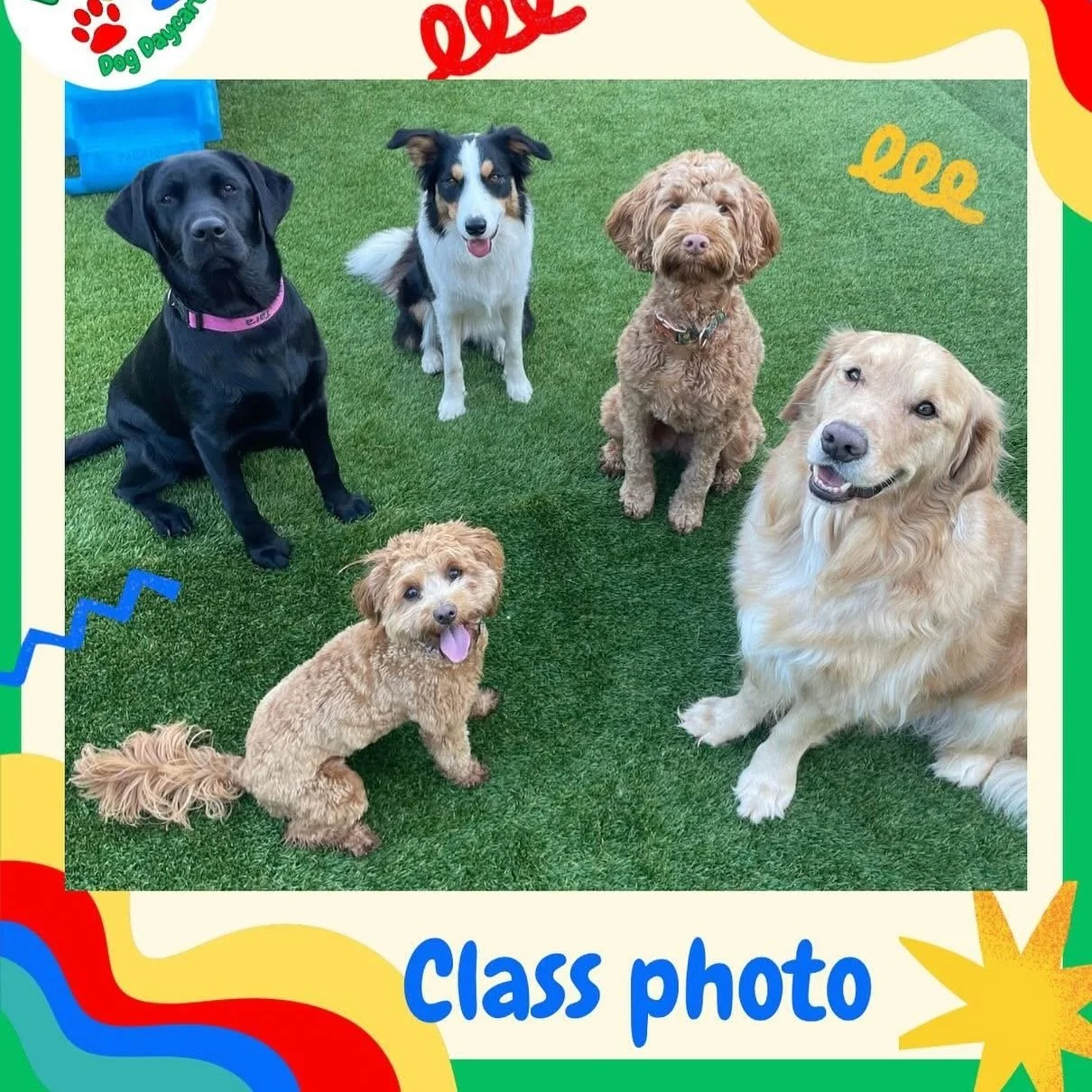 Five dogs sitting on green grass, including a black Labrador, a black and white Australian Shepherd, a curly brown poodle, a light-colored poodle, and a golden retriever, with colorful decorative border and the text "Class photo"