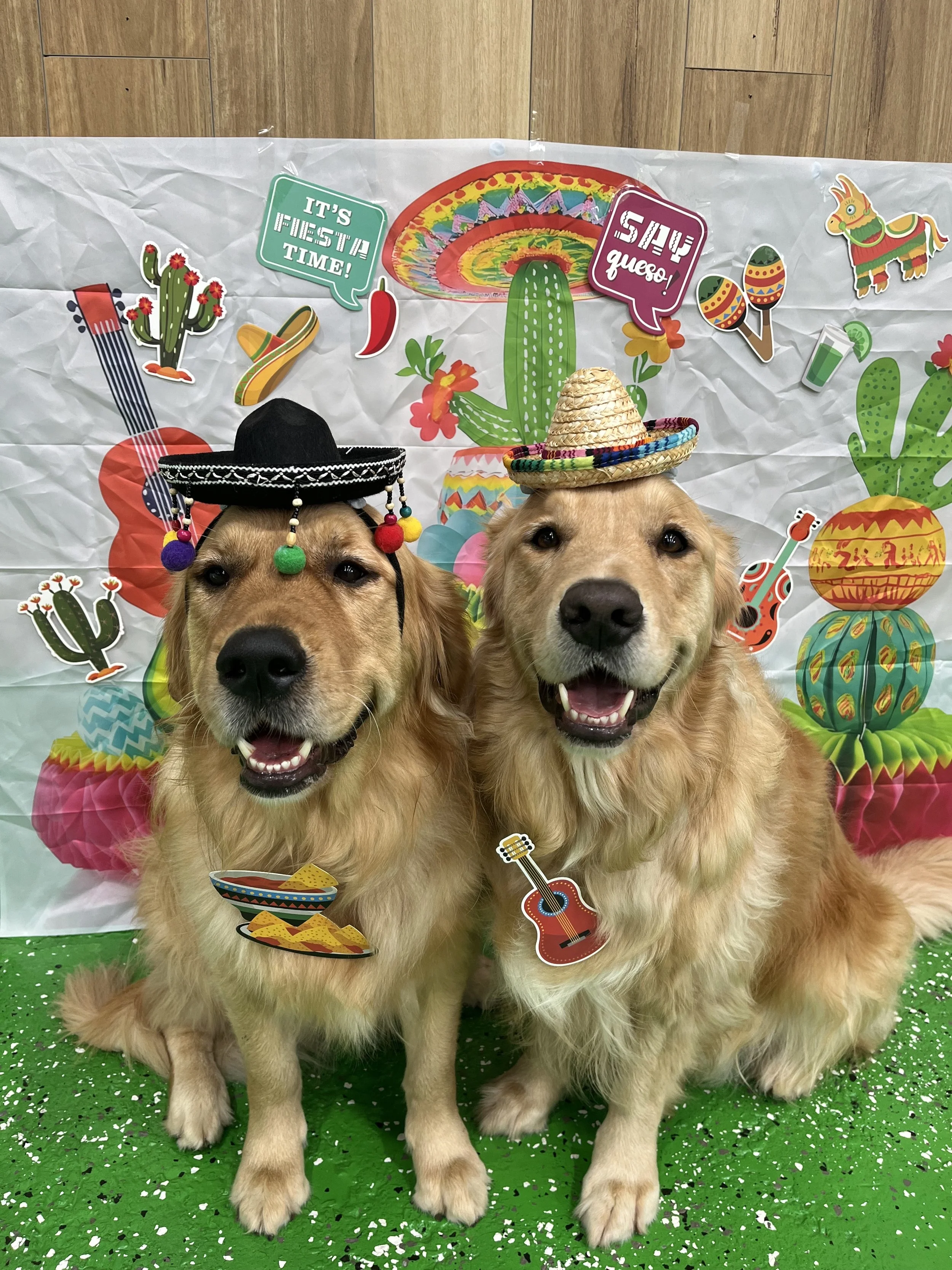 Two golden retrievers wearing sombreros and festive decorations in front of a Cinco de Mayo-themed backdrop.